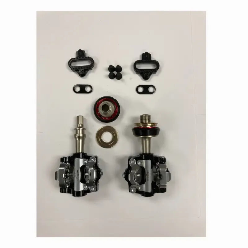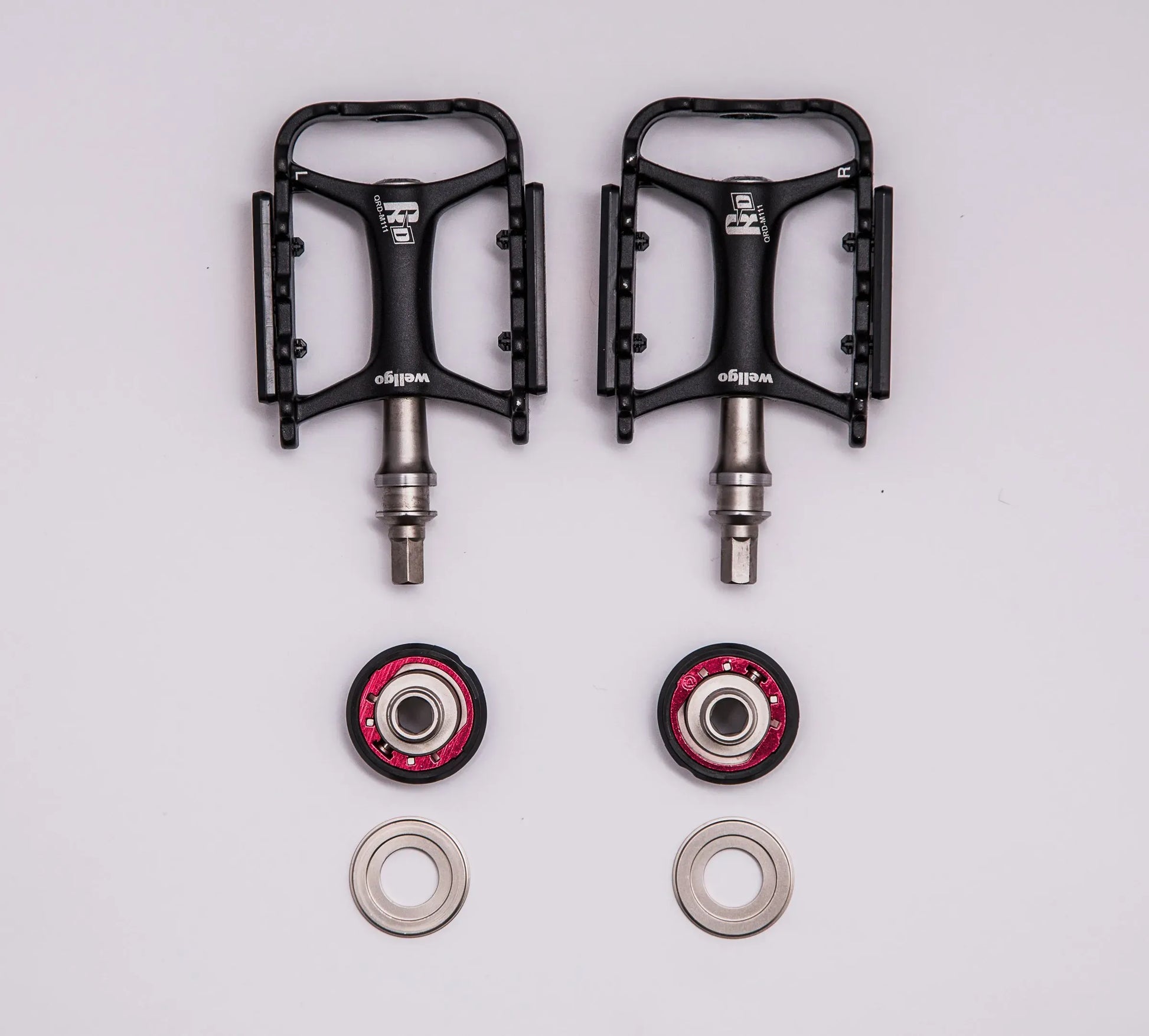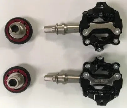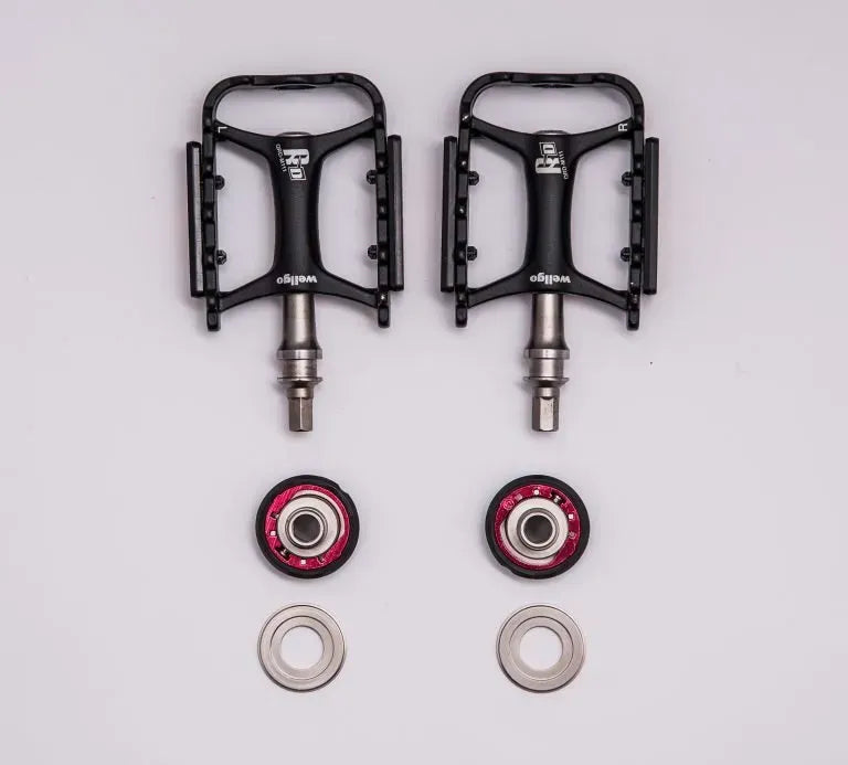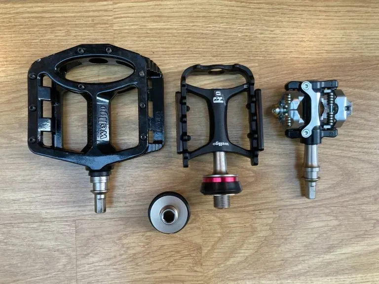 Wellgo latch heads work with a red ring and black ring that move independently to latch and lock the pedal into place for riding. The Wellgo removable pedal family has 3 types: Flat (small and light), mountain bike (big and grippy), and clip-in SPD (for cycling shoes). Which is right for you?