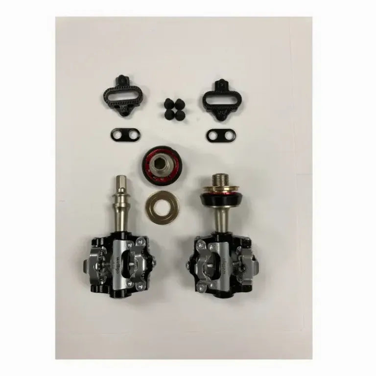 • SPD Pedals: 2" (5cm) x 2" (5cm). 13.4oz (380 grams). Double-sided, MTB-style clip-in, with shoe cleats.