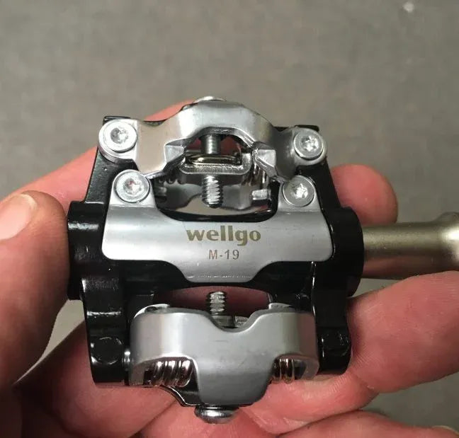 Wellgo latch heads work with a red ring and black ring that move independently to latch and lock the pedal into place for riding. The Wellgo removable pedal family has 3 types: Flat (small and light), mountain bike (big and grippy), and clip-in SPD (for cycling shoes). Which is right for you?